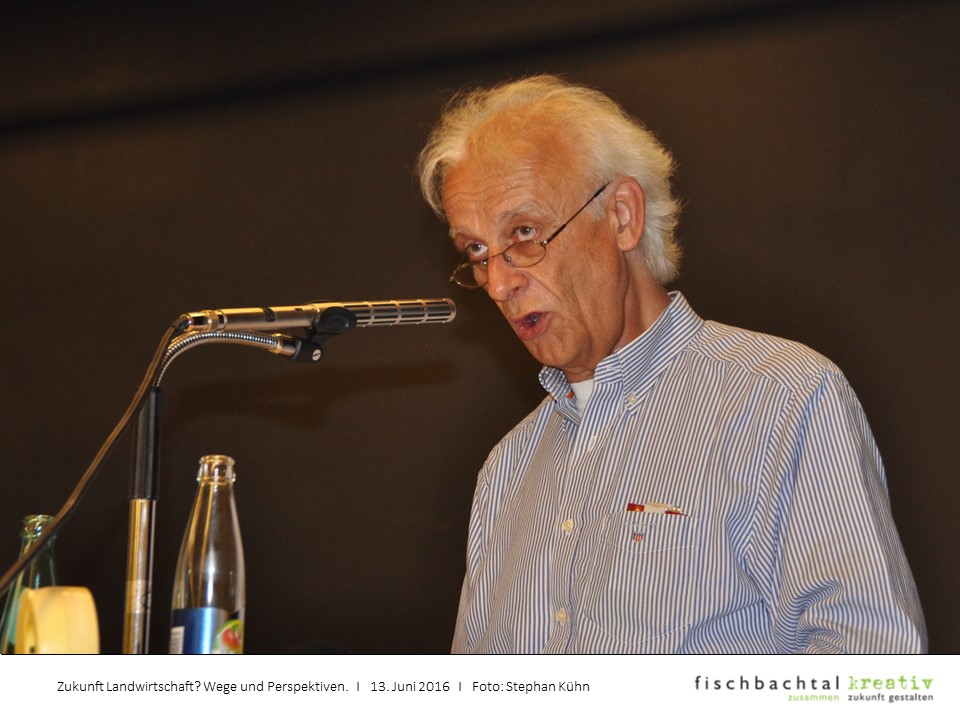 Thomas Göbel vom Hofgut Oberfeld in Darmstadt betonte zunächst einen wesentlichen Unterschied zu seinen Vorrednern, denn nicht er sei der Besitzer dieses Hofes, vielmehr gehöre der rund 120 BürgerInnen, allesamt AktionärInnen der entsprechenden Aktiengesellschaft. Eindrucksvoll beschrieb er, wie dort ökologische Landwirtschaft nicht für das Umfeld, sondern mit dem Umfeld betrieben wird, inzwischen mit beträchtlichem Erfolg.